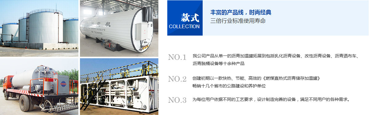 目前我公司產(chǎn)品從單一的瀝青加溫罐拓展到包括乳化瀝青設備、改性瀝青設備、瀝青灑布車、瀝青脫桶設備等十余種產(chǎn)品。